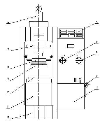 圖中:1—液壓源 2—注油(yóu)孔 3—送油(yóu)閥 4—回油閥 5—電測儀(yí)表 6—調節絲杠副 7—調節手(shǒu)輪 8—調心球頭副 9—上壓板 10—下壓板 11—油缸活塞副 12—機架